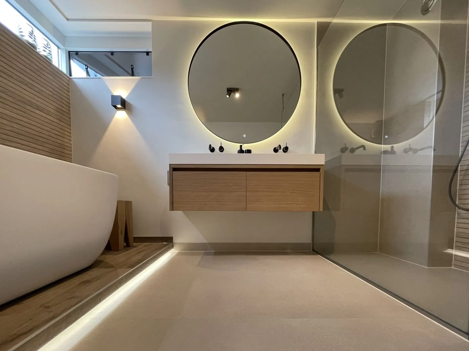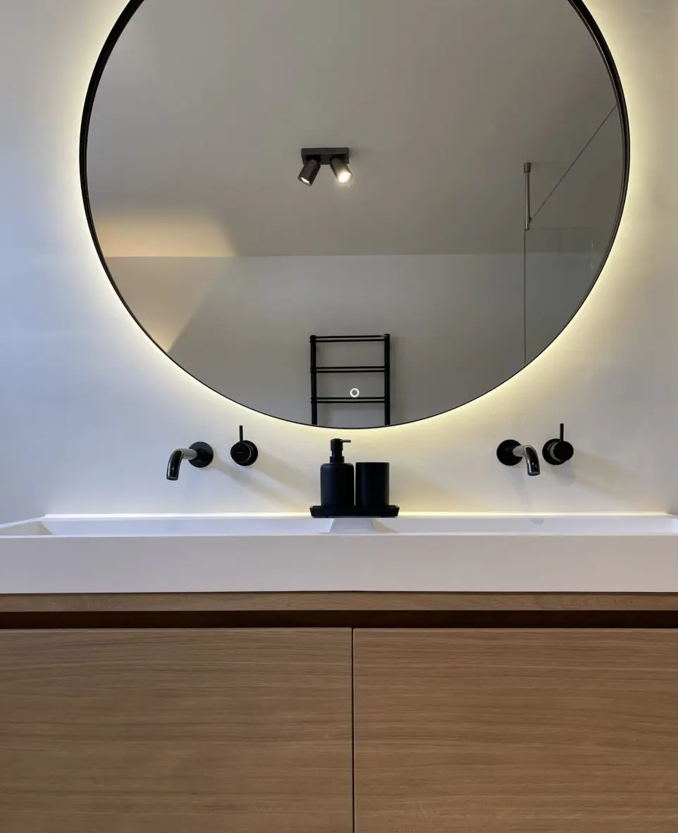 Denk ook eens aan de volgende toevoegingen: spiegelkast dubbelspiegelend, hoge of halfhoge kolomkast, spiegels met geïntegreerde LED-verlichting of gewoon een opbouw LED spot, wandpanelen met blinde bevestiging en een matching WC meubel in dezelfde kleur.